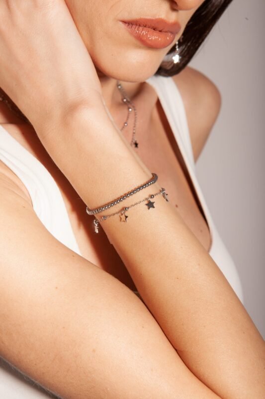Bracciale Doppio a Pallini con Stelline Pendenti Acciaio