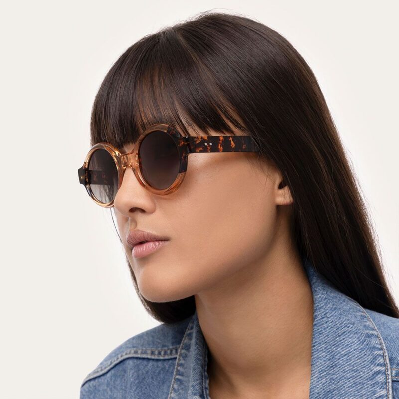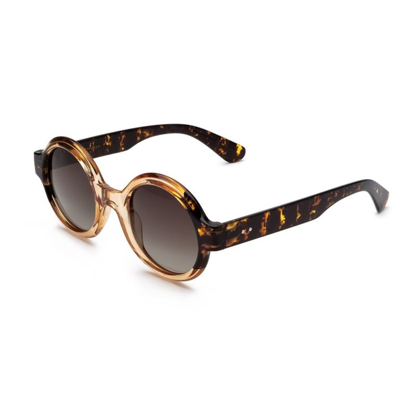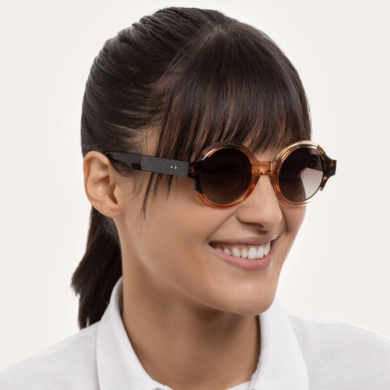 Occhiali da sole Bangkok rotondi. Montatura trasparente colore caramello/tartarugato in materiale riciclato e lenti polarizzate. Nella confezione è inclusa una custodia morbida con panno per la pulizia del prodotto. Categoria di filtro 3. Abbina gli occhiali da sole ai tuoi gioielli preferiti e portali sempre con te. Leggeri, pratici e comodi da indossare, sono i compagni di viaggio perfetti per le avventure di ogni giorno.